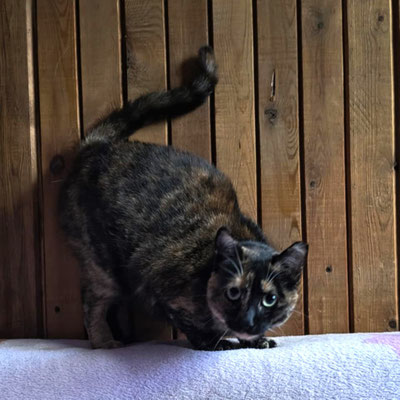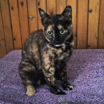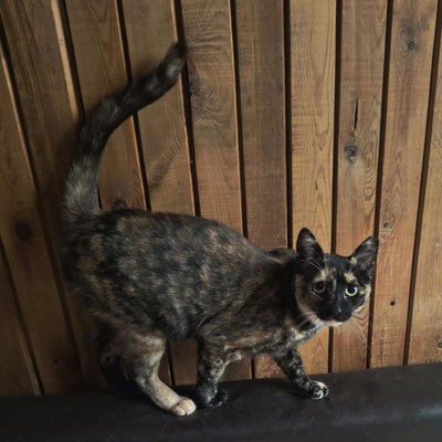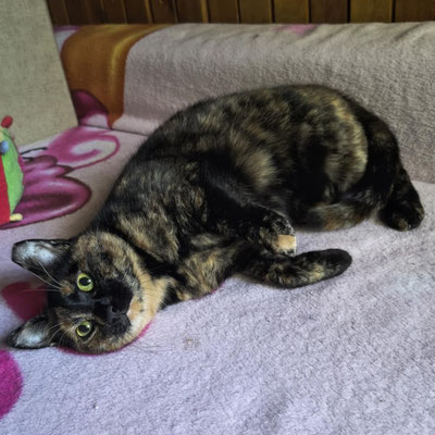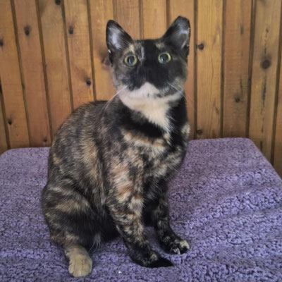 Die hübsche dreifarbige Katze ist eine sogenannte "Glückskatze" und liebt die Nähe zu Menschen. Malvina beginnt sofort zu schnurren, sobald jemand den Raum betritt. Sie ist sehr verschmust und anhänglich.