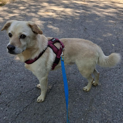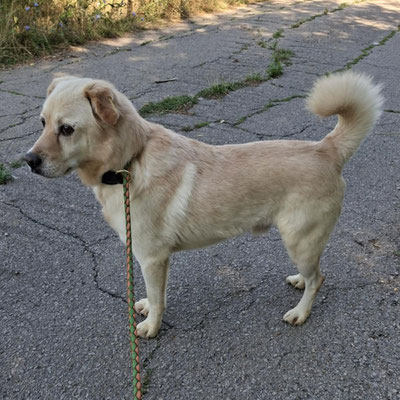 Er läuft tadellos an der Leine. Besonders liebt er Wasser und freut sich über Ausflüge an den Fluss.