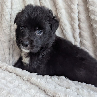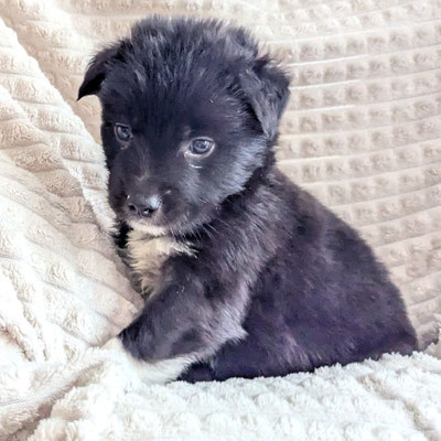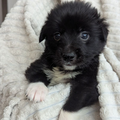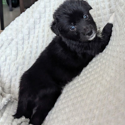 Pixel war bei der Geburt einer der kleinsten Welpen des Wurfs, hat sich jedoch sehr gut entwickelt und ist heute ein gesunder, kräftiger Welpe. Er ist fast vollständig schwarz und trägt auffällige weiße „Socken“ an den Beinen.