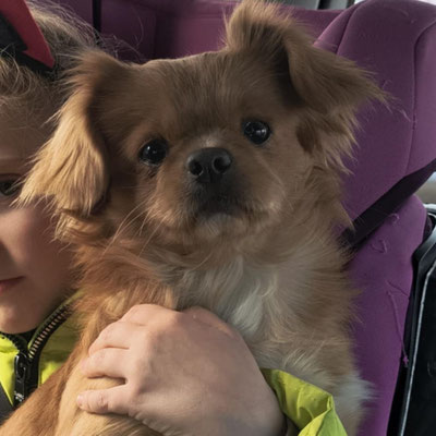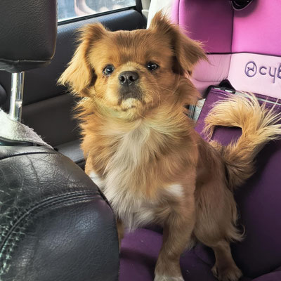Der kleine Rüde geht sehr gerne Gassi und kann an der Leine laufen. Auch im Auto fährt er ruhig mit und genießt die Fahrt.